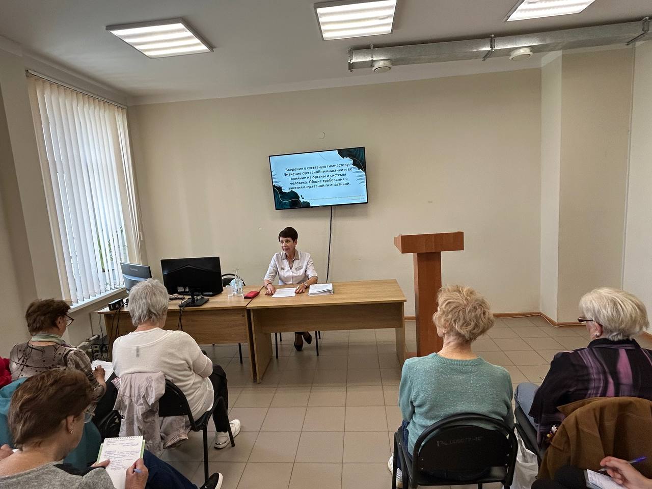 В рамках реализации регионального проекта «Пенсионеры» с целью поддержания активной физической формы людей старшего поколения и проведения обучения волонтеров главным внештатным специалистом по спортивной медицине МЗ ПО Смирновой Юлией представлены доклады по одному из направлений проекта – « Суставная гимнастика» участникам проекта.