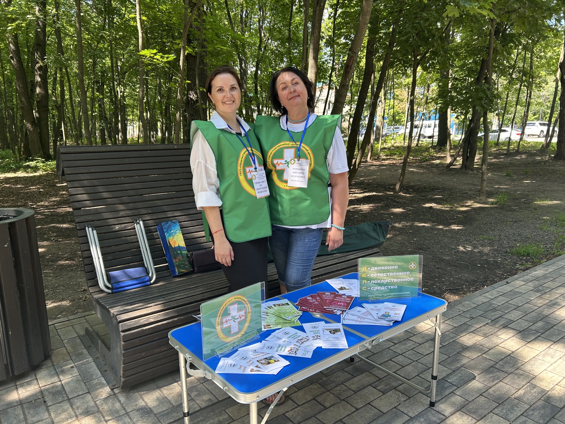 В рамках профилактической акции « Парковая зона – территория здоровья», которая прошла 25 июля на Олимпийской аллее, врач по спортивной медицине Атякшева Татьяна Николаевна и медицинская сестра Даньшина Виктория Валерьевна провели мастер -класс по скандинавской ходьбе и комплексу физических упражнений для укрепления мышц шейного отдела позвоночника.